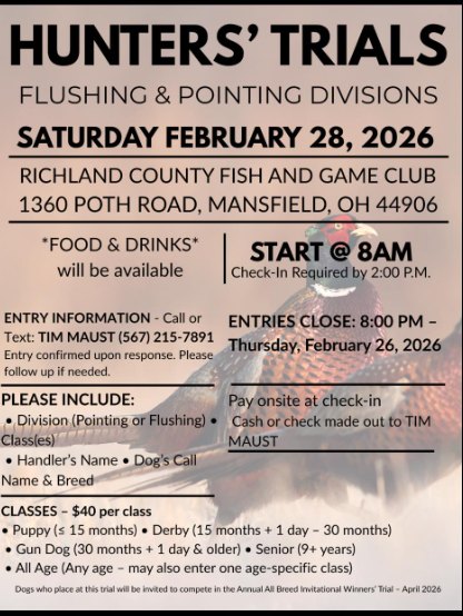 Reminder March 1st through July 15th all fields are closed to hunting and walking activities, this also includes dogs. Only fields that are open are 2 dog training fields 13 and 14. You can walk the firebreaks around the fields but dogs have to be on leash and out of fields. Thank you for a great hunting season.